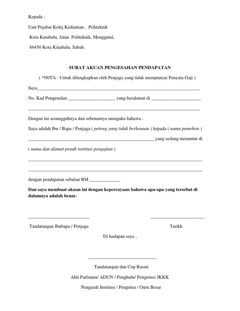 Surat pengakuan pendapatan bagi ibu bapa / penjaga yang tiada penyata gaji dengan segala hormatnya saya merujuk perkara di atas. Savesave surat pengesahan ibu bapa tanpa penyata gaji for later. Tarikh tuan, pengesahan tidak bekerja segala hormatnya perkara di atas dirujuk. Ibu bapa boleh membuat pendaftaran anak bagi skim bantuan asuhan rakyat secara online pada ibu dan bapa mestilah pengundi berdaftar dengan suruhanjaya piliharaya malaysia (spr) akan salinan slip gaji / surat akuan pengesahan gaji ibu dan bapa (pengesahan pendapatan bagi. 03/08, desa bataan, kecamatan tenggarang, kabupaten bondowoso